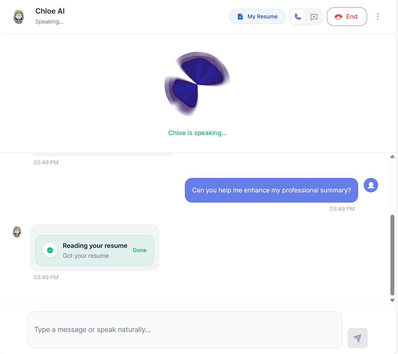 Talk to Chloe AI through voice or chat, share your target role, and get immediate direction on what to rewrite, clarify, or cut before you apply.